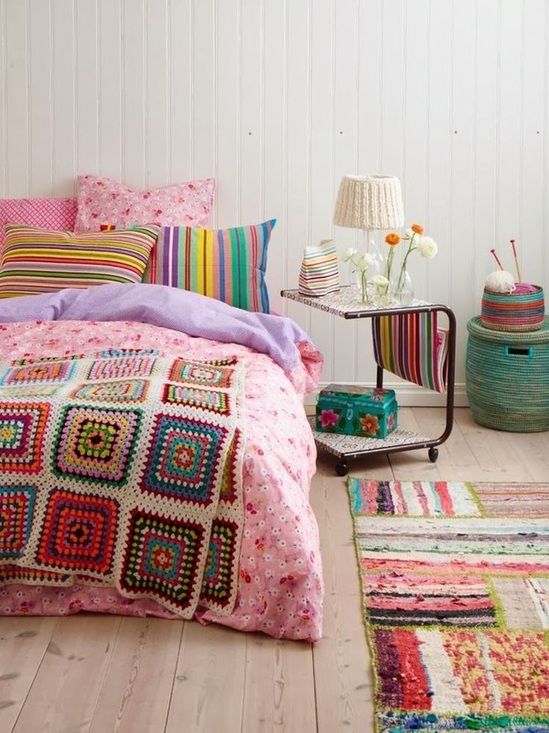 Sabemos hacer ganchillo, Rebeca, pero no nos entusiasma. Una de nosotras empezó una colcha y lleva con ella como siete años… Sin embargo, tenemos la suerte de tener madres y abuelas que si lo hacían y gracias a ellas tenemos en casa colchas, tapetes, agarraderas… que son los reyes de la casa. ¡Nos priva para decorar! Aunque las nuestras no son tan coloridas y alegres como las imágenes que nos muestran, y es que antes todo se reducía al blanco o beig.